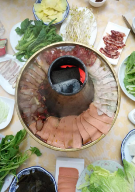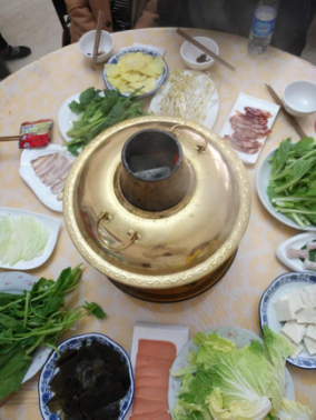 5点下山,回到酒店,开始晚餐:特色臧家火锅?;鸸奈兜阑故呛懿淮淼模魈庖运夭宋魅馐澄?,厨师刀工特别好,肉薄似纱,私人订制一人一片。