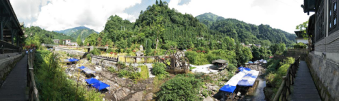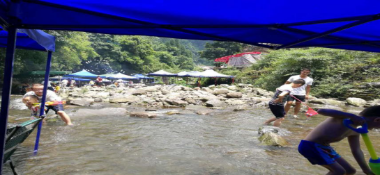 又有清流激湍,映带左右,景区内之商民,借其独有之地势,顺势而造,引潺潺山泉作纳暑之曲水。吾众列坐其次;俯视眼下清泉,叮咚叮铃之流水,荡人心涤。此水时而平静蓄势,行至陡壁或回环处,犹如百舸争流,争先恐后,形成水花一朵朵,似那春日满山桃花开,烂漫一幕幕。