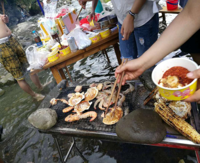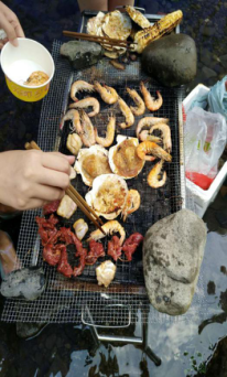 及至申时,盖因有一吃货领导,携吾众于清泉中自炙,虽曰不为“流觞曲水”,但觉亦几矣。虽无鱼翅鲍鱼之盛,一蚝一贝,亦足以令人大块朵颖;且啖炙,且饮酒,且看众孩童戏水多欢乐,爽哉快哉!至酉时,天色渐晚,众人欲驱车归家,实属意犹未尽,又择地把酒言欢,且以歌伴酒,且以酒助兴,欢声笑语,相逢何需多言,共饮一壶老酒,哪管那明日春秋,其乐融融。直至次日凌晨,众人皆尽兴而归。此所谓乘兴而来,尽兴而归??煸湛煸?!