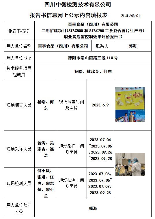 百事食品(四川)有限公司 二期扩建项目(STAX500和STAX750二条复合薯片生产线) 职业病危害控制效果评价报告书