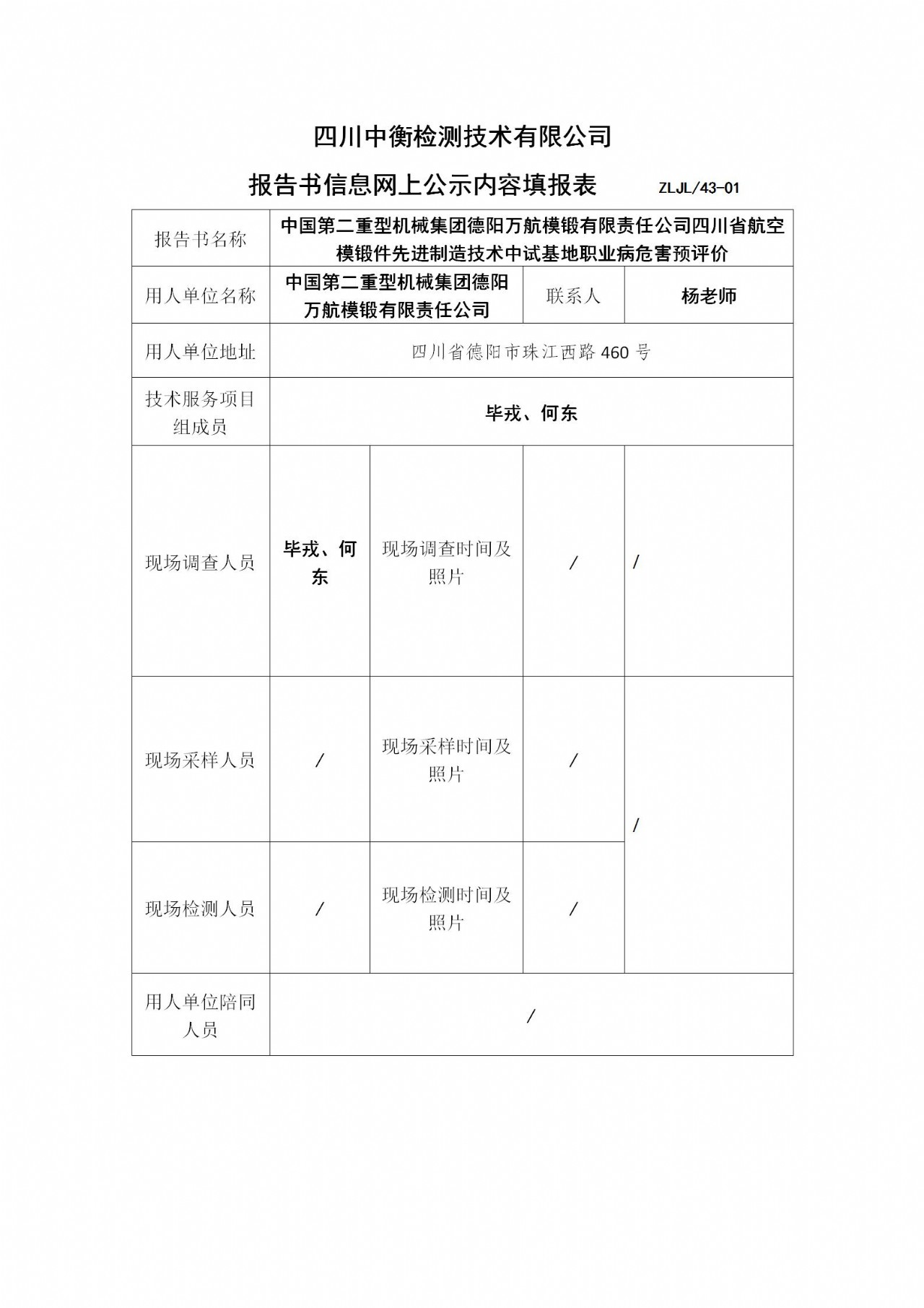 中国第二重型机械集团德阳万航模锻有限责任公司四川省航空模锻件先进制造技术中试基地职业病危害预评价