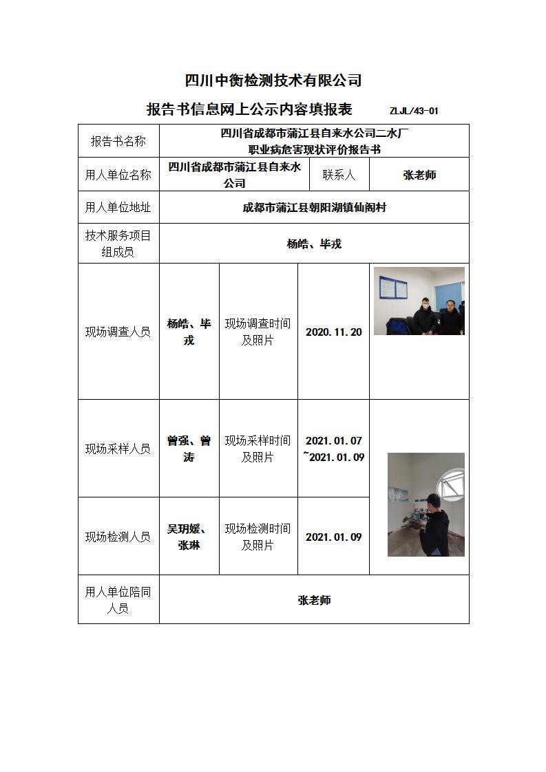 四川省成都市蒲江县自来水公司二水厂 职业病危害现状评价