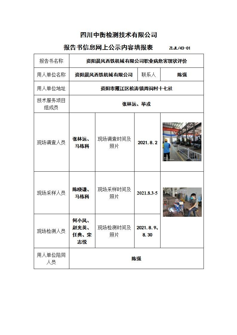 资阳晨风西铁机械有限公司职业病危害现状评价