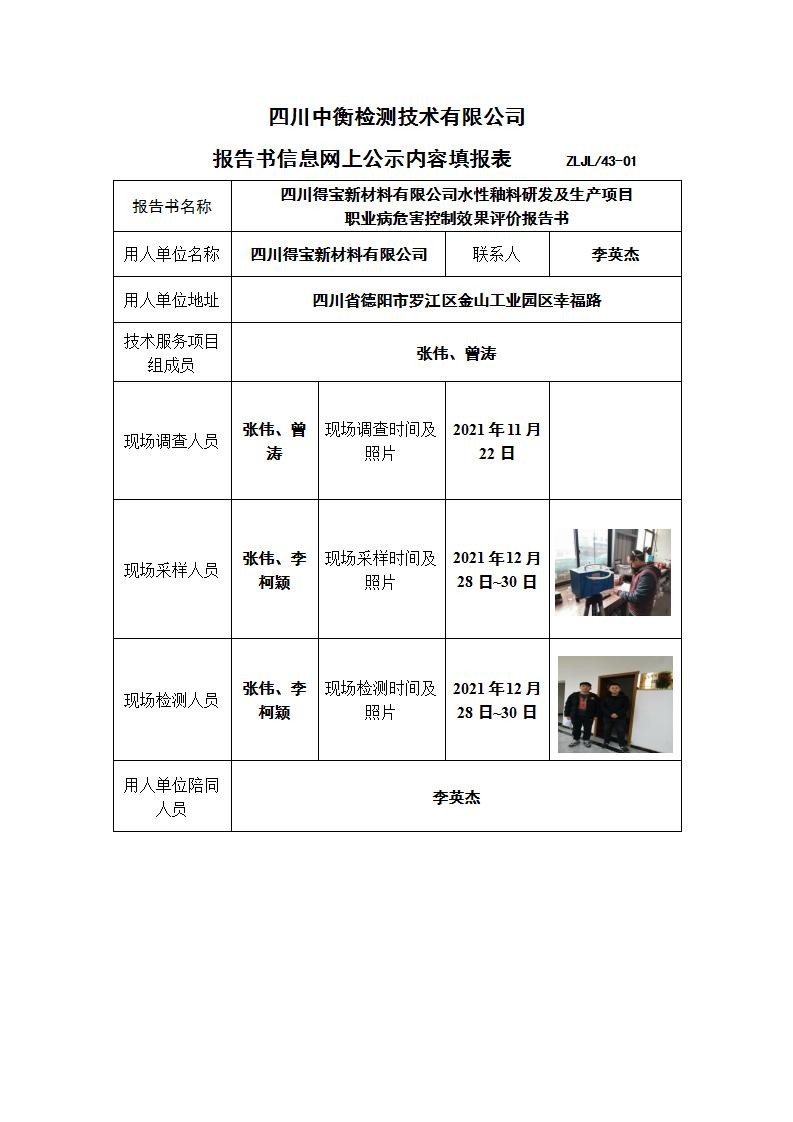 四川得宝新材料有限公司水性釉料研发及生产项目 职业病危害控制效果评价