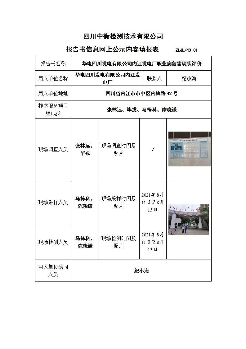 华电四川发电有限公司内江发电厂职业病危害现状评价