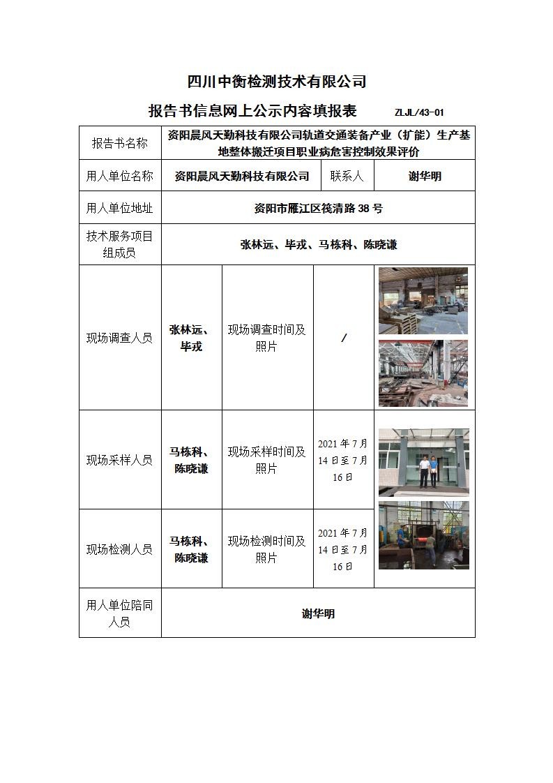 资阳晨风天勤科技有限公司轨道交通装备产业(扩能)生产基地整体搬迁项目职业病危害控制效果评价