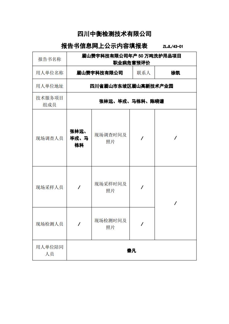 眉山赞宇科技有限公司年产50万吨洗护用品项目职业病危害预评价