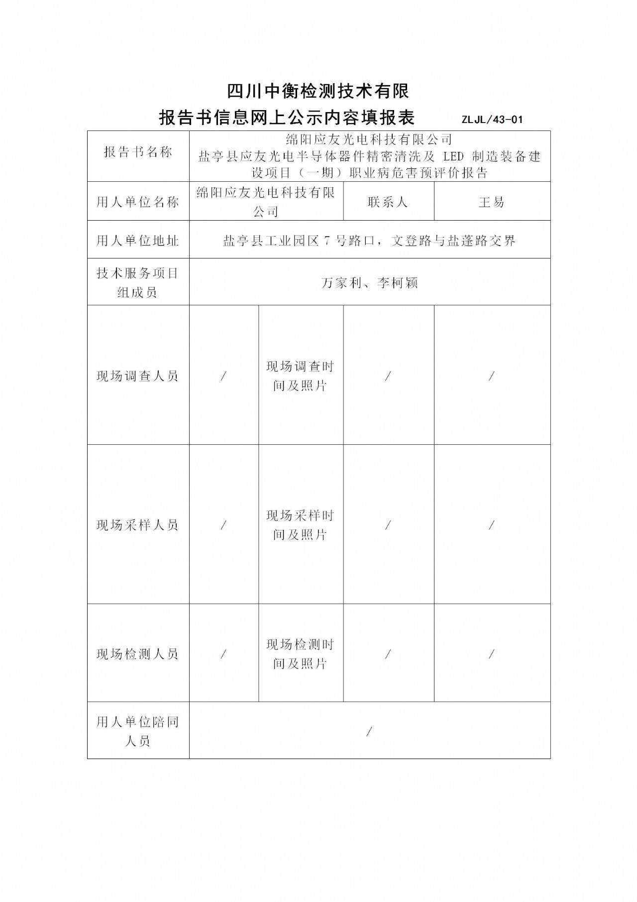 绵阳应友光电科技有限公司 盐亭县应友光电半导体器件精密清洗及 LED 制造装备建设项目(一期)职业病危害预评价