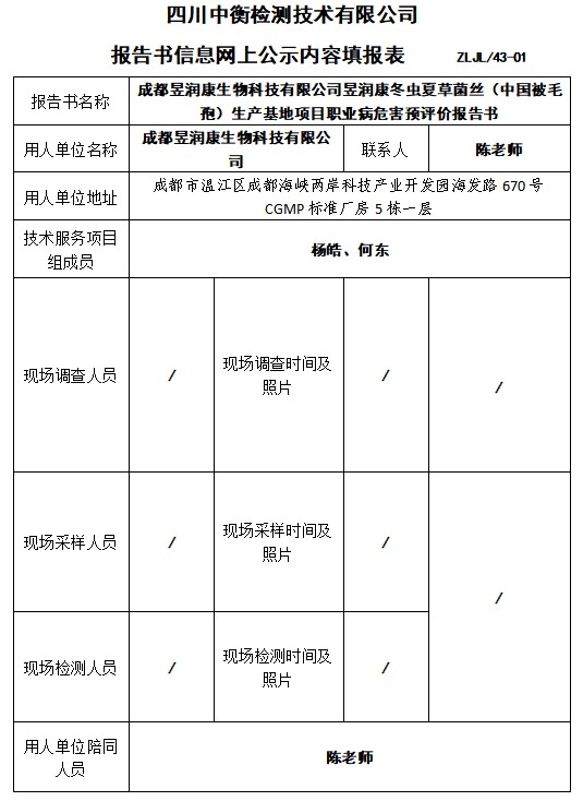 成都昱润康生物科技有限公司昱润康冬虫夏草菌丝(中国被毛孢)生产基地项目职业病危害预评价