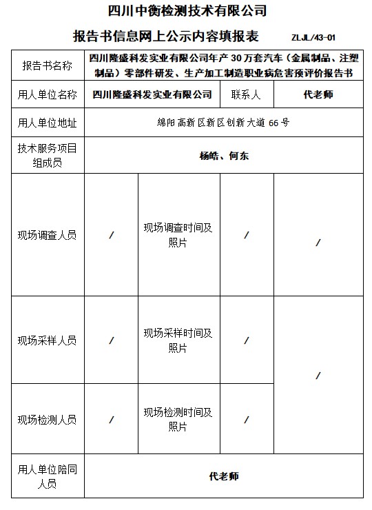 四川隆盛科发实业有限公司年产30万套汽车(金属制品、注塑制品)零部件研发、生产加工制造职业病危害预评价