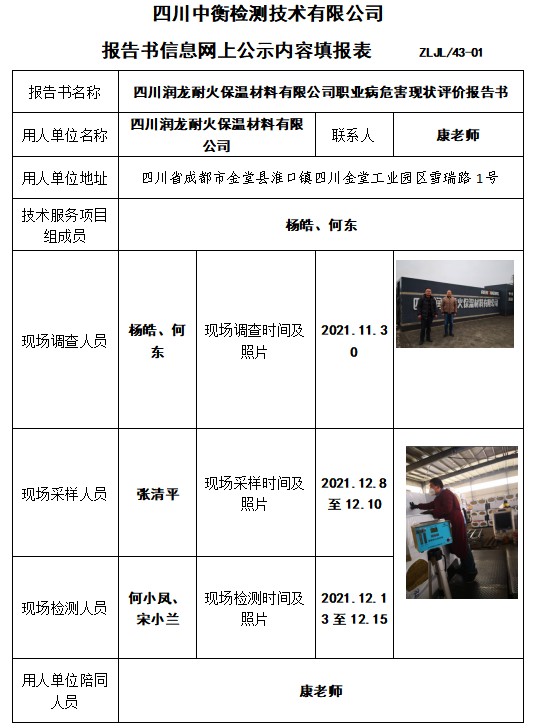 四川润龙耐火保温材料有限公司职业病危害现状评价