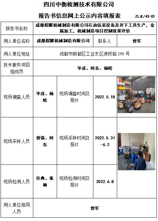 成都煜耀机械制造有限公司石油钻采设备及井下工具生产,金属加工,机械制造项目控制效果评价
