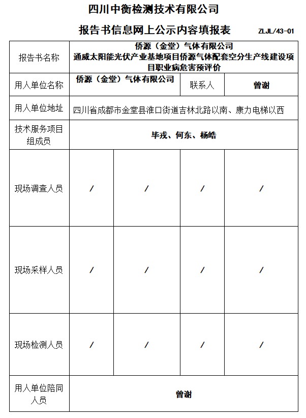 侨源(金堂)气体有限公司 通威太阳能光伏产业基地项目侨源气体配套空分生产线建设项目职业病危害预评价