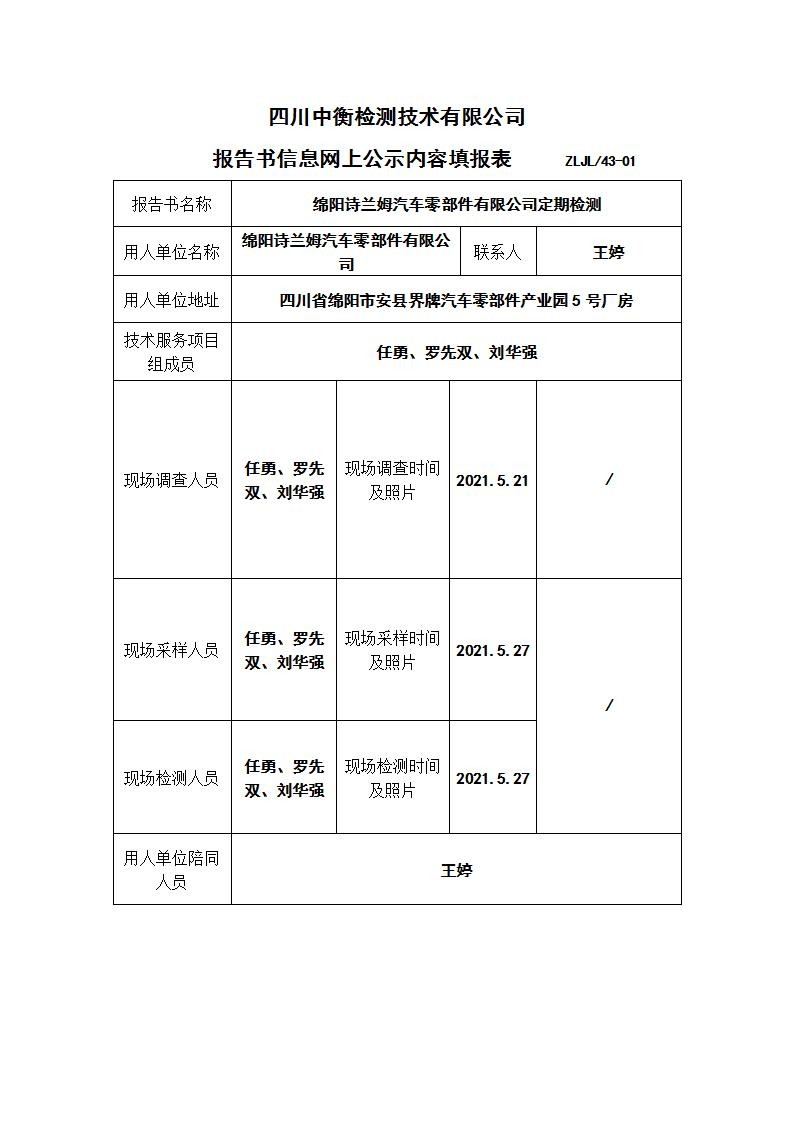 绵阳诗兰姆汽车零部件有限公司职业病危害定期检测