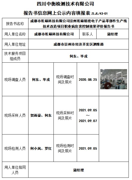 成都市乾硕科技有限公司崇州乾硕精密电子产品零部件生产线技术改造项目职业病危害控制效果评价