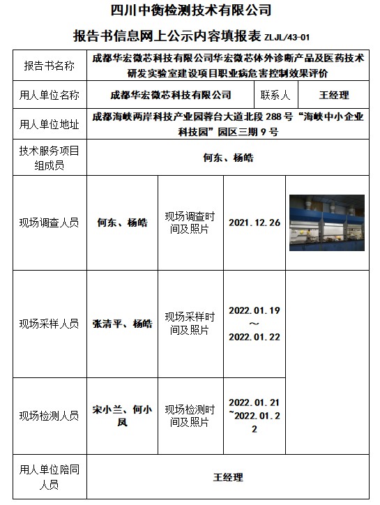 成都华宏微芯科技有限公司华宏微芯体外诊断产品及医药技术 研发实验室建设项目职业病危害控制效果评价