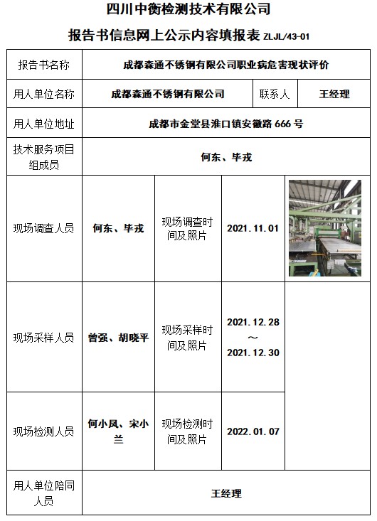 成都森通不锈钢有限公司职业病危害现状评价