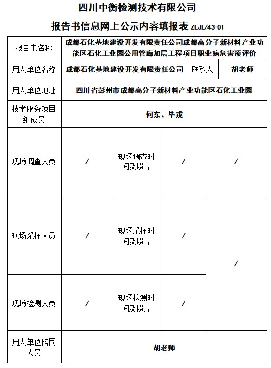 成都石化基地建设开发有限责任公司成都高分子新材料产业功能区石化工业园公用管廊加层工程项目职业病危害预评价