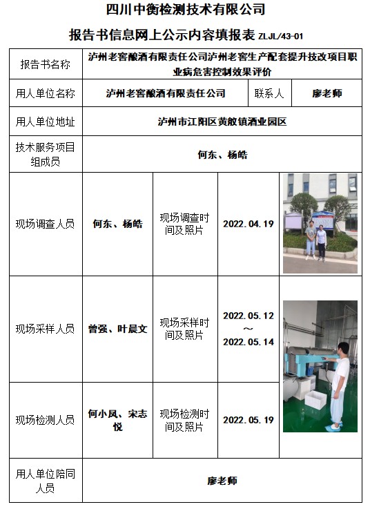 泸州老窖酿酒有限责任公司泸州老窖生产配套提升技改项目职业病危害控制效果评价