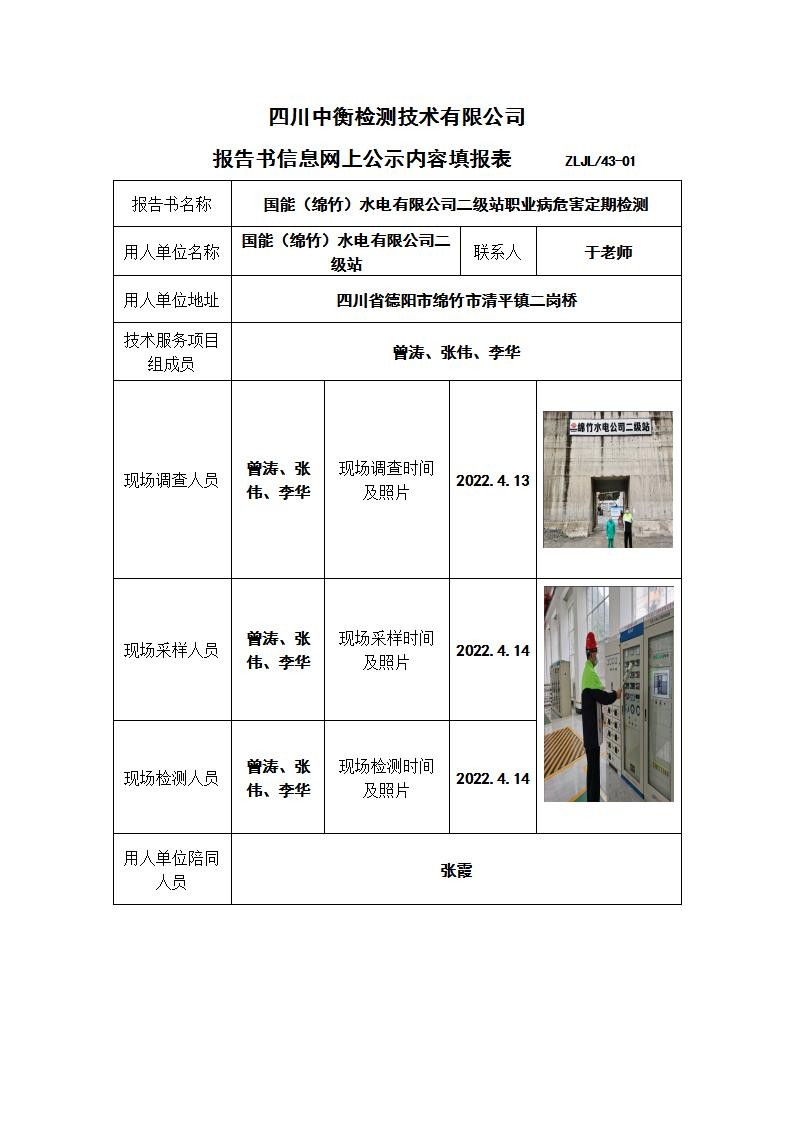 国能(绵竹)水电有限公司二级站职业病危害定期检测