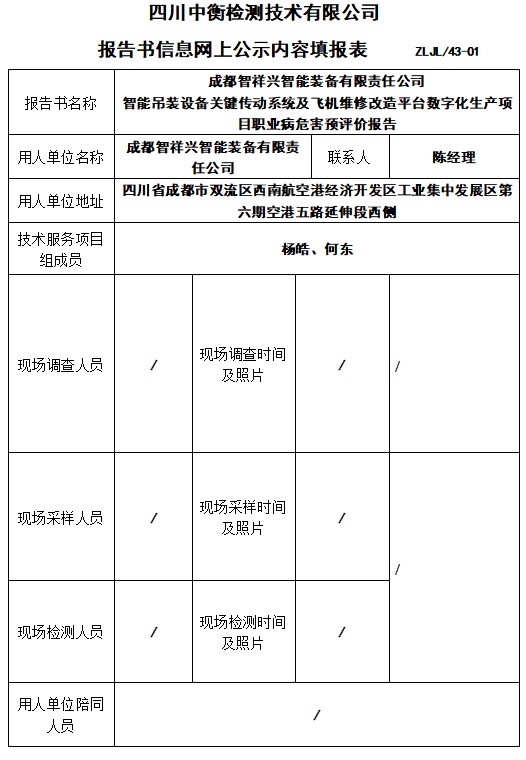 成都智祥兴智能装备有限责任公司 智能吊装设备关键传动系统及飞机维修改造平台数字化生产项目职业病危害预评价