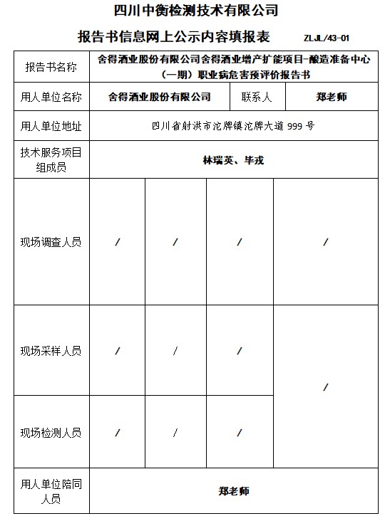舍得酒业股份有限公司舍得酒业增产扩能项目-酿造准备中心 (一期)职业病危害预评价