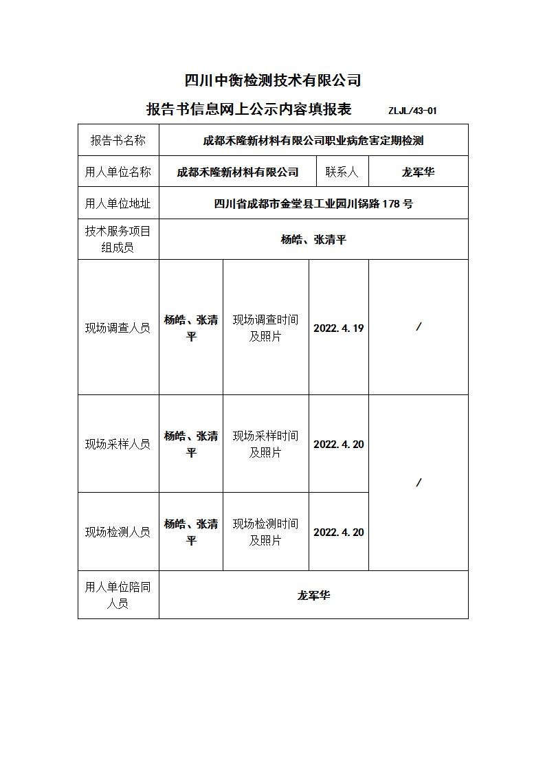 成都禾隆新材料有限公司职业病危害定期检测