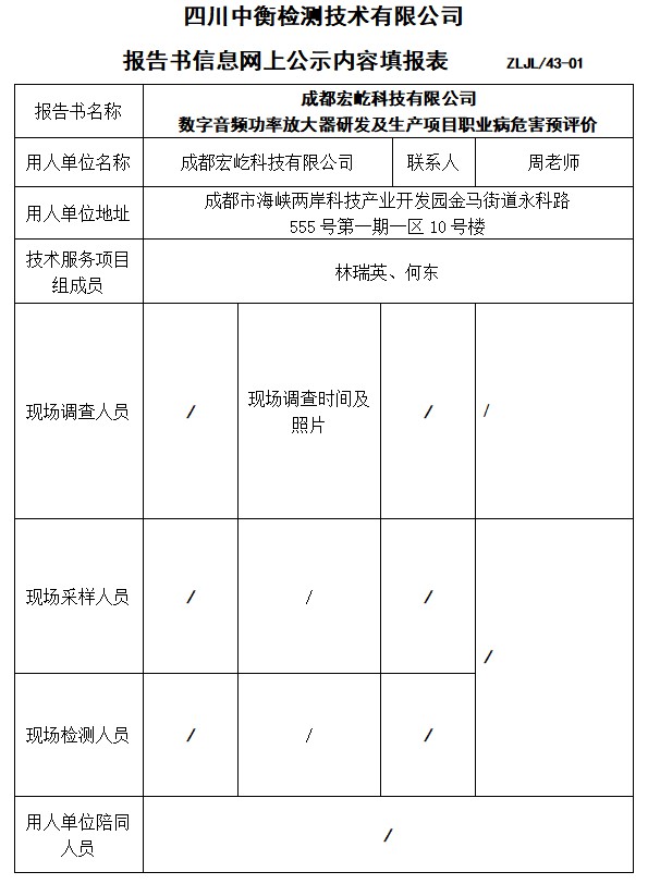 成都宏屹科技有限公司 数字音频功率放大器研发及生产项目职业病危害预评价