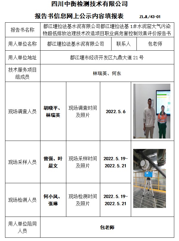都江堰拉法基水泥有限公司都江堰拉法基1#水泥窑大气污染物超低排放治理技术改造项目职业病危害控制效果评价