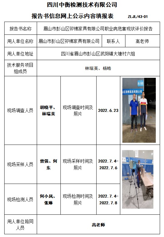眉山市彭山区卯榫家具有限公司职业病危害现状评价