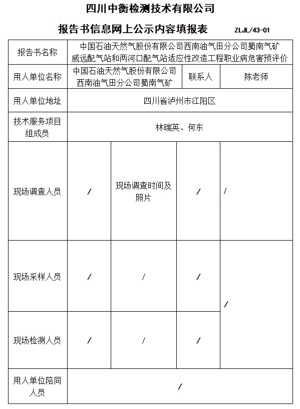 中国石油天然气股份有限公司西南油气田分公司蜀南气矿 威远配气站和两河口配气站适应性改造工程职业病危害预评价