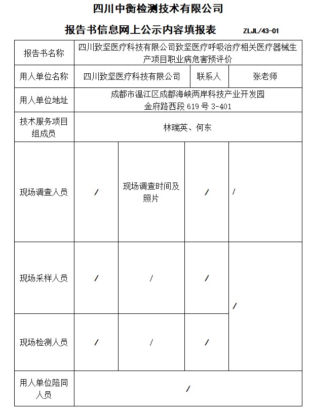 四川致坚医疗科技有限公司致坚医疗呼吸治疗相关医疗器械生产项目职业病危害预评价