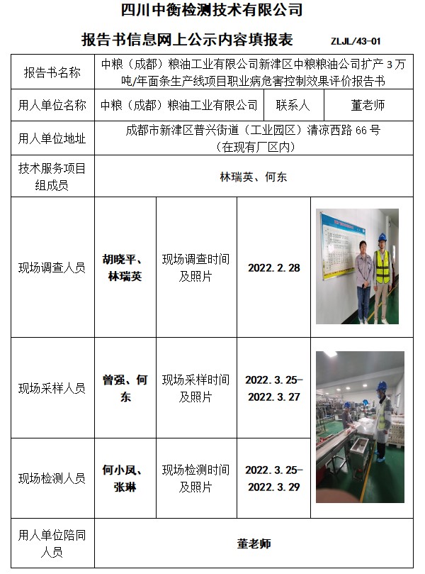 中粮(成都)粮油工业有限公司新津区中粮粮油公司扩产3万吨/年面条生产线项目职业病危害控制效果评价