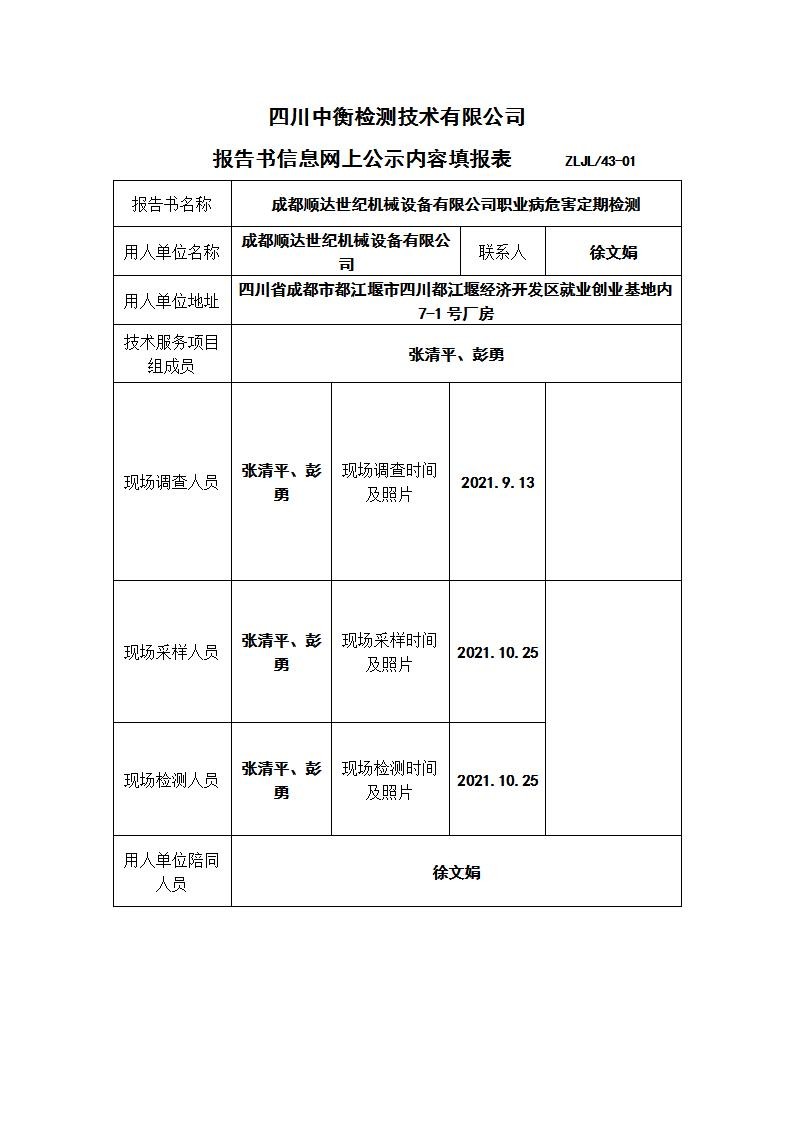 成都顺达世纪机械设备有限公司职业病危害定期检测