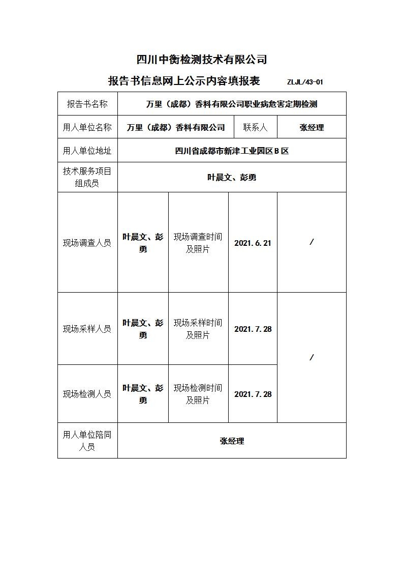 万里(成都)香料有限公司职业病危害定期检测