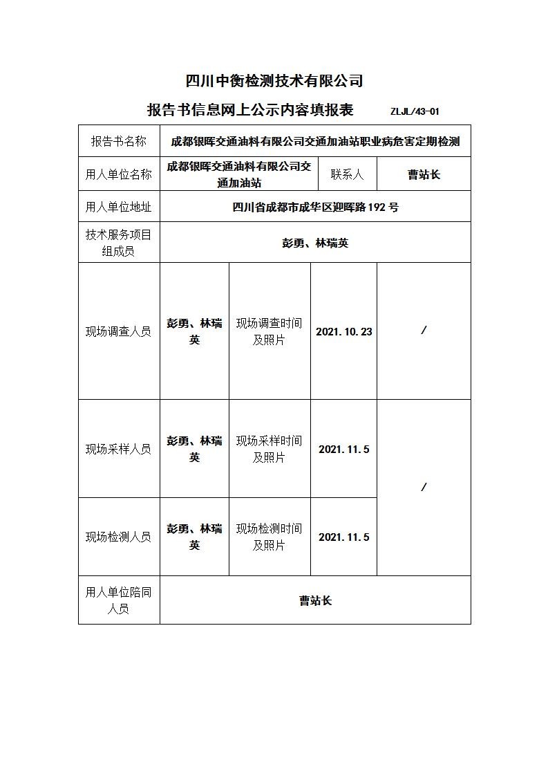 成都银晖交通油料有限公司交通加油站职业病危害定期检测