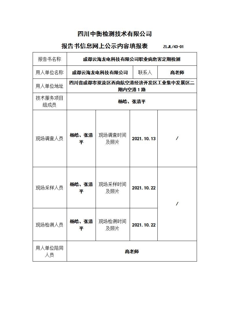 成都云海龙电科技有限公司职业病危害定期检测