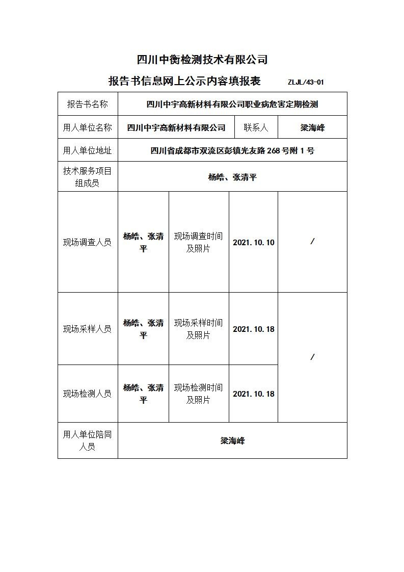 四川中宇高新材料有限公司职业病危害定期检测