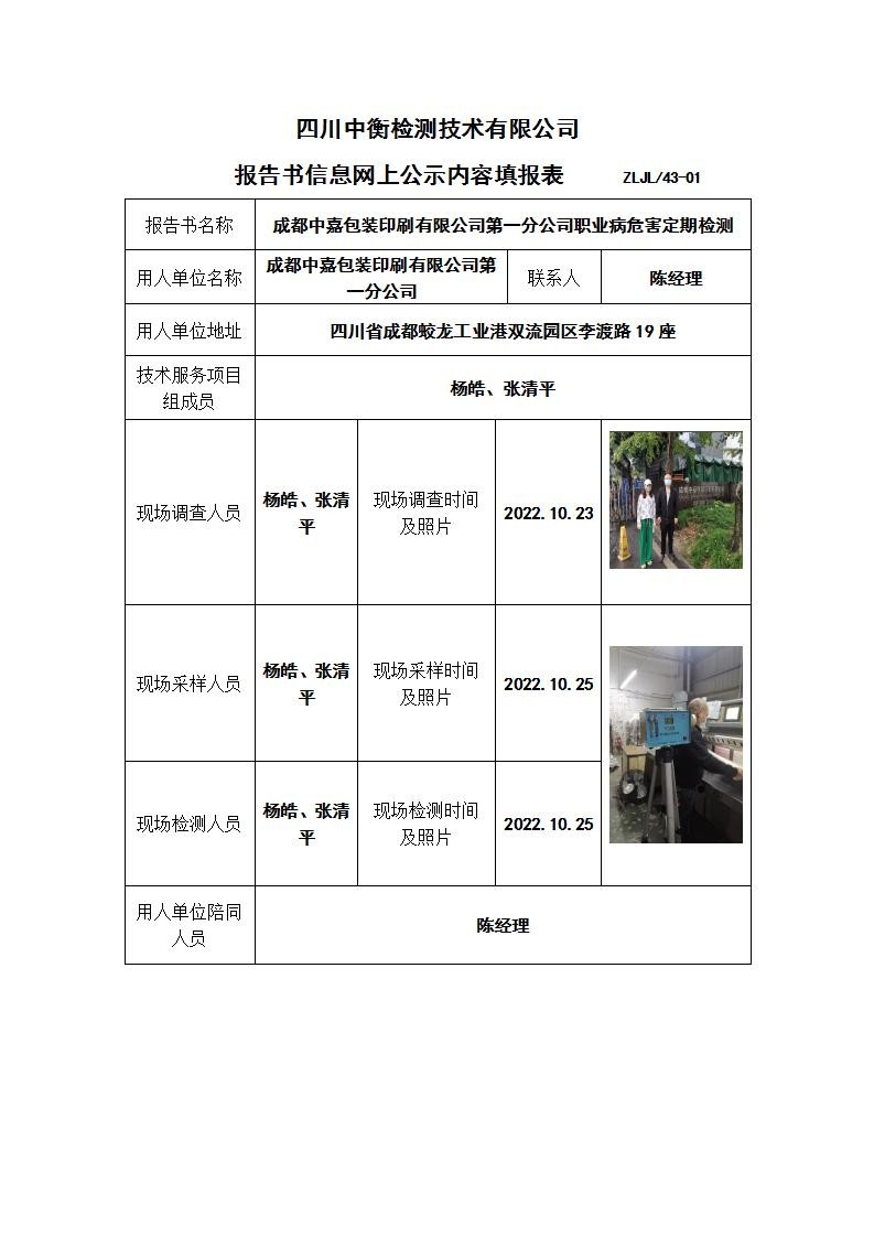 成都中嘉包装印刷有限公司第一分公司职业病危害定期检测
