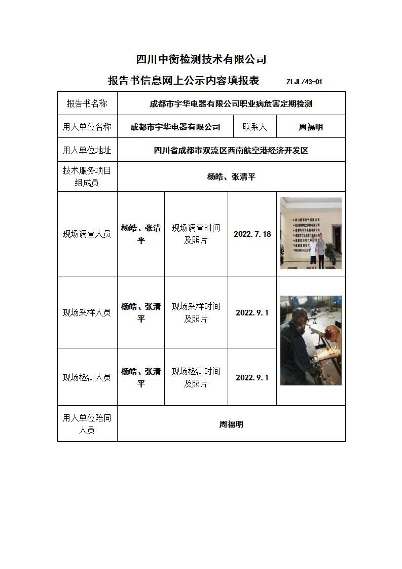 成都市宇华电器有限公司职业病危害定期检测
