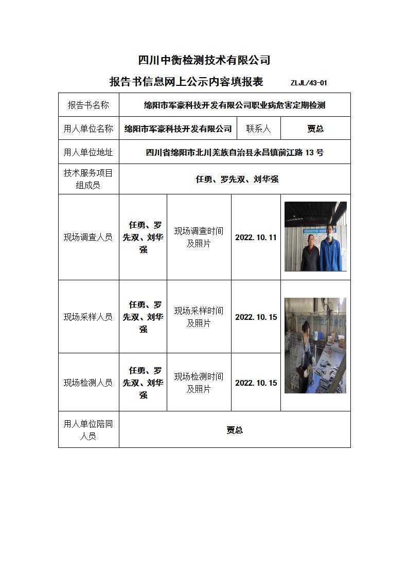 绵阳市军豪科技开发有限公司职业病危害定期检测