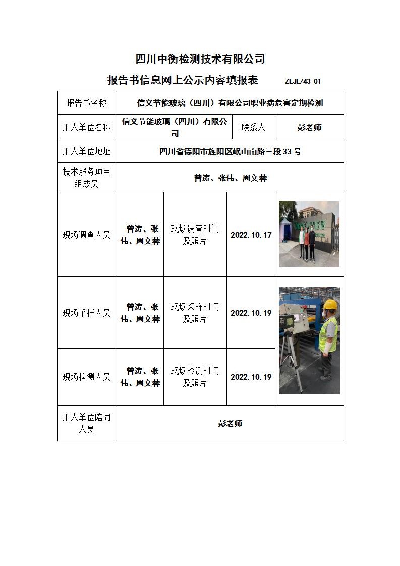 信义节能玻璃(四川)有限公司职业病危害定期检测