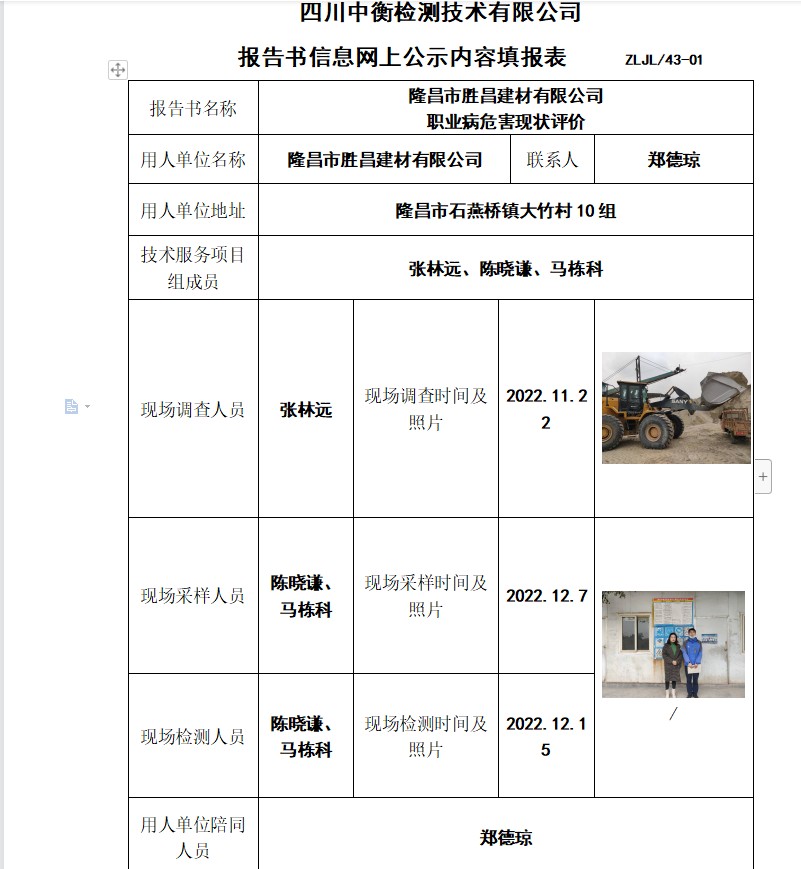 隆昌市胜昌建材有限公司 职业病危害现状评价