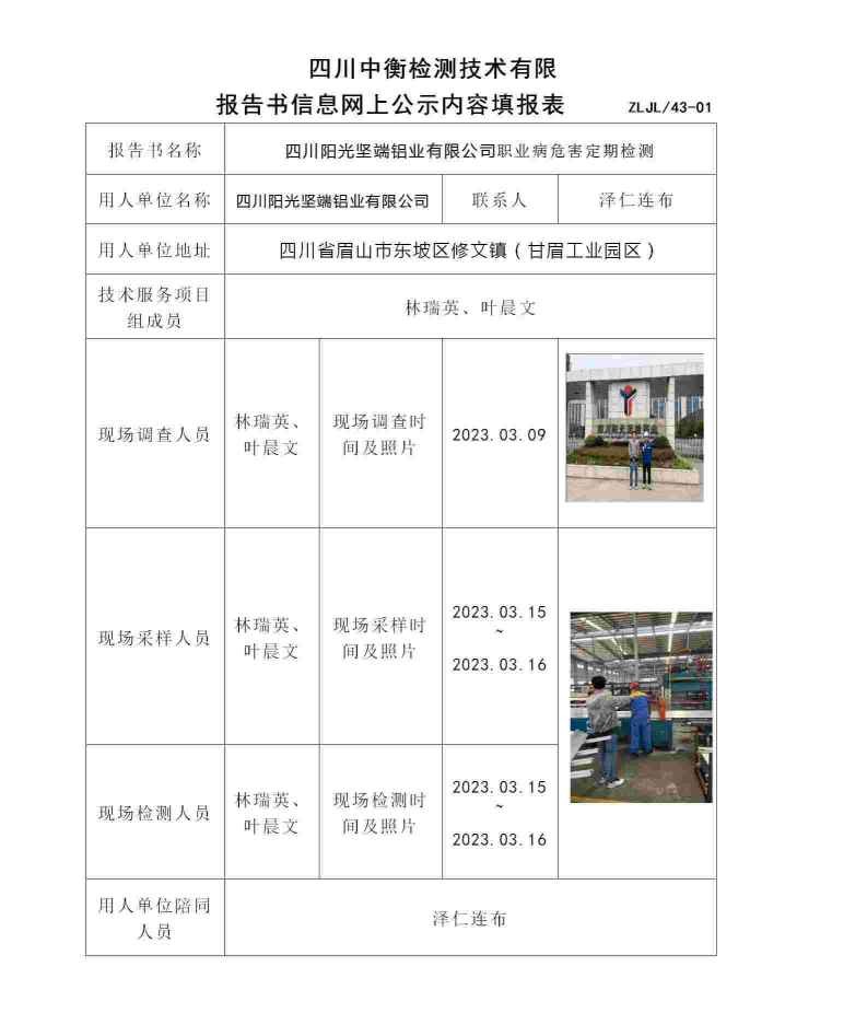 四川阳光坚端铝业有限公司职业病危害定期检测