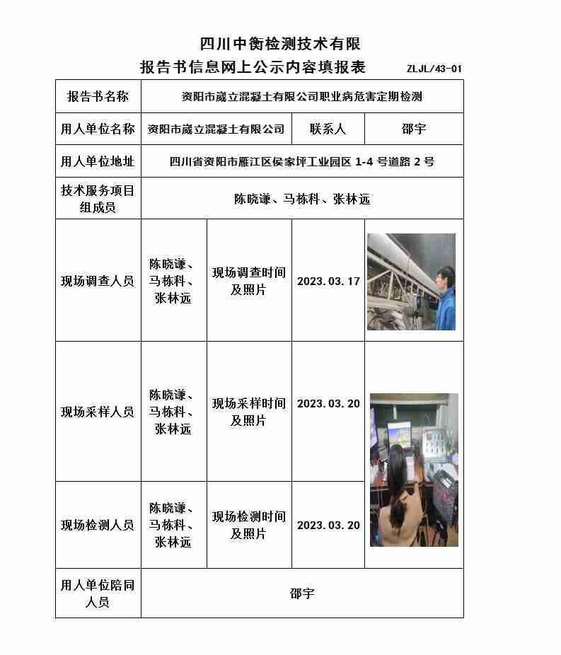 资阳市崴立混凝土有限公司职业病危害定期检测