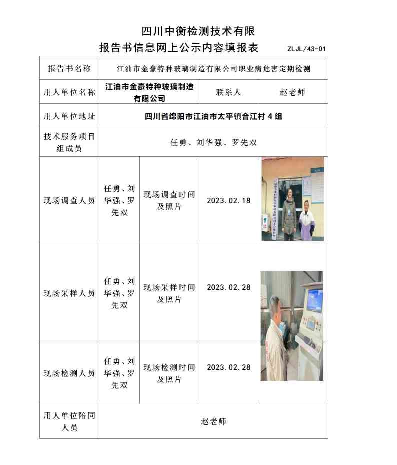 江油市金豪特种玻璃制造有限公司职业病危害定期检测