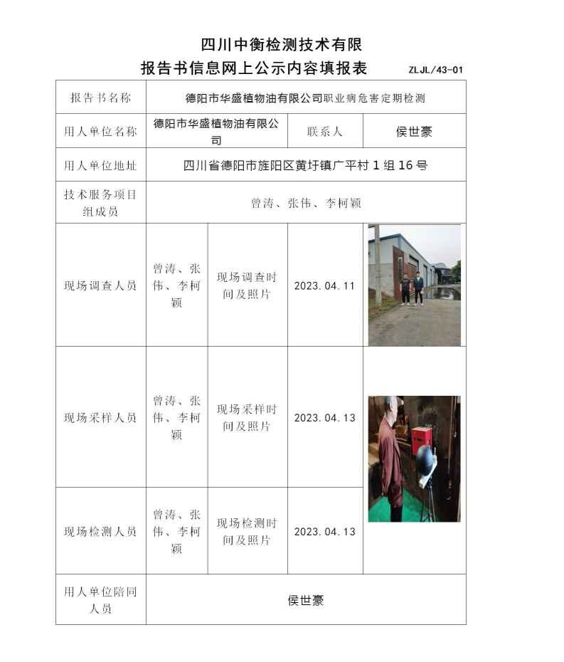 德阳市华盛植物油有限公司职业病危害定期检测
