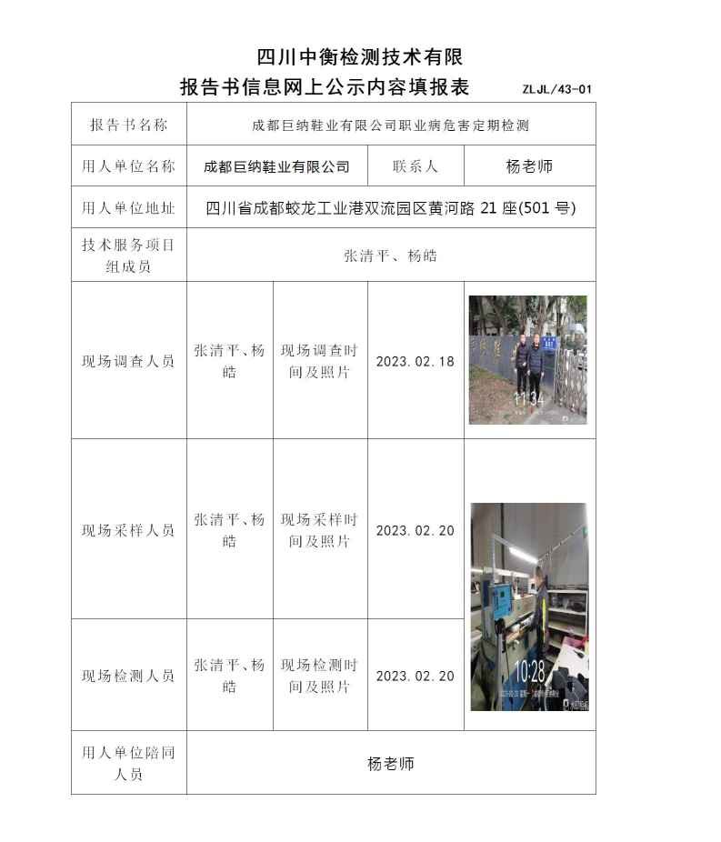成都巨纳鞋业有限公司职业病危害定期检测