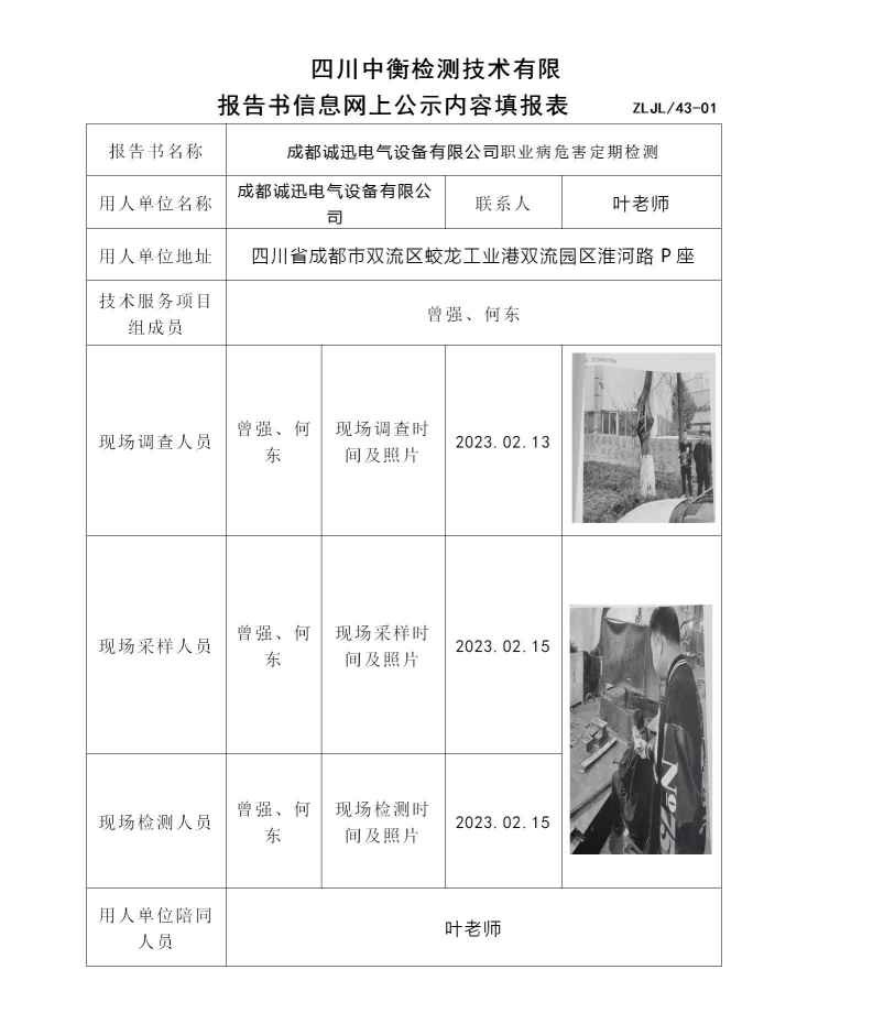 成都诚迅电气设备有限公司职业病危害定期检测