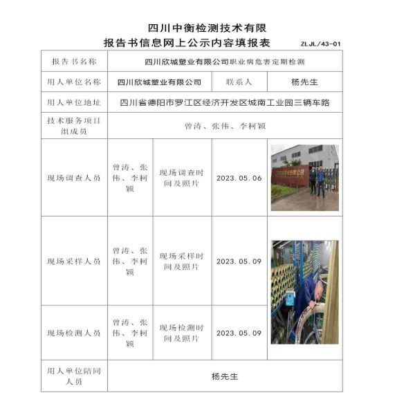 四川欣城塑业有限公司职业病危害定期检测